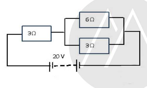 The figure shows a network of three resistors connected to a 20 V battery.