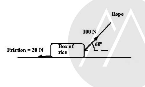 In the figure, a shop keeper pulls a bag of rice of mass 50 kg along a rough horizontal floor, against a frictional force of 20N.