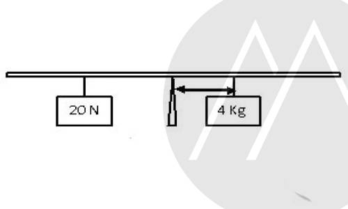 The figure shows a system of two masses in equilibrium, resting on a weightless beam of length 100 cm, pivoted at its center of gravity.