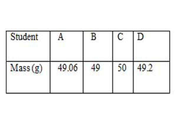 Four students measure the mass of an object, each using a different scale. They record their results as follows: Which student used the most precise scale?